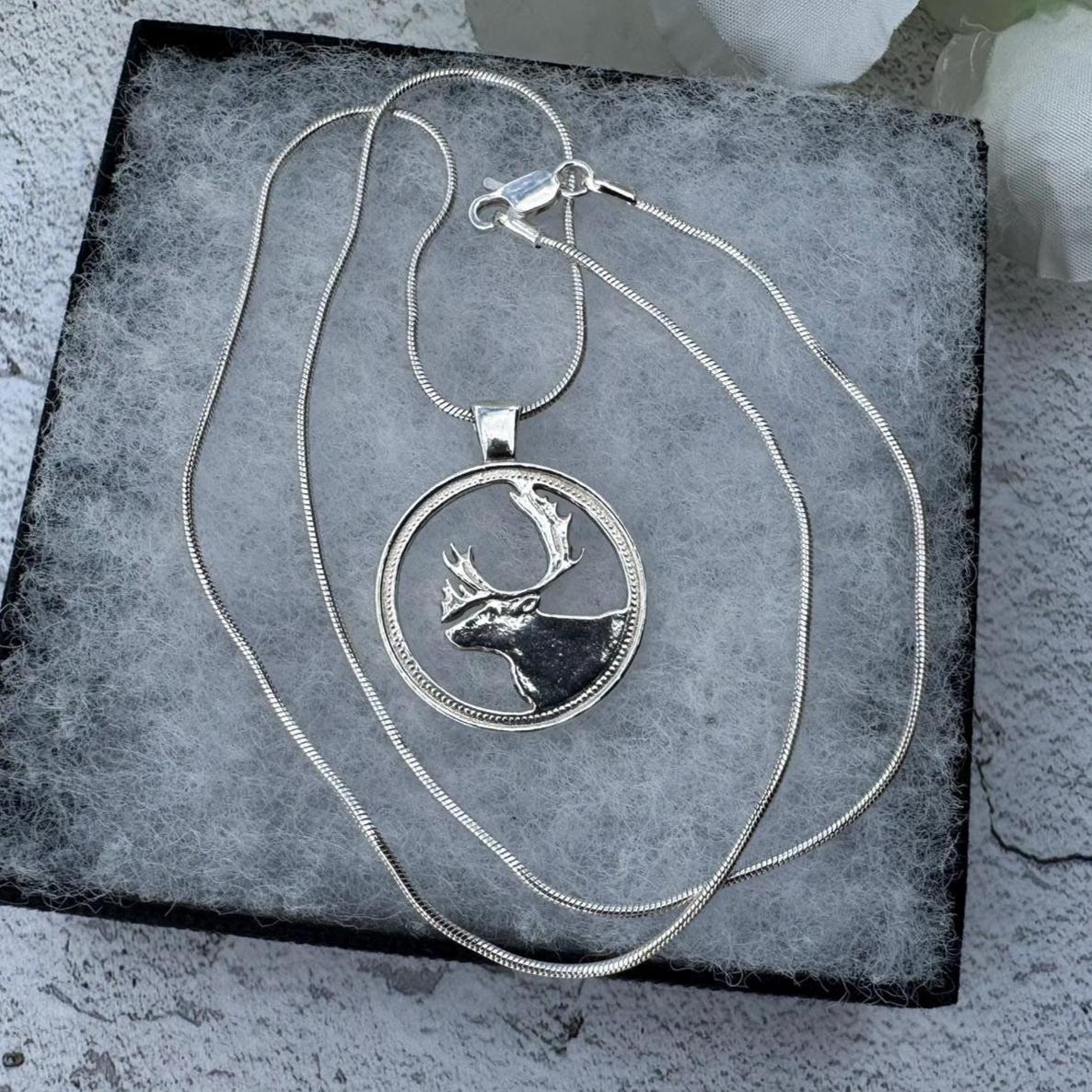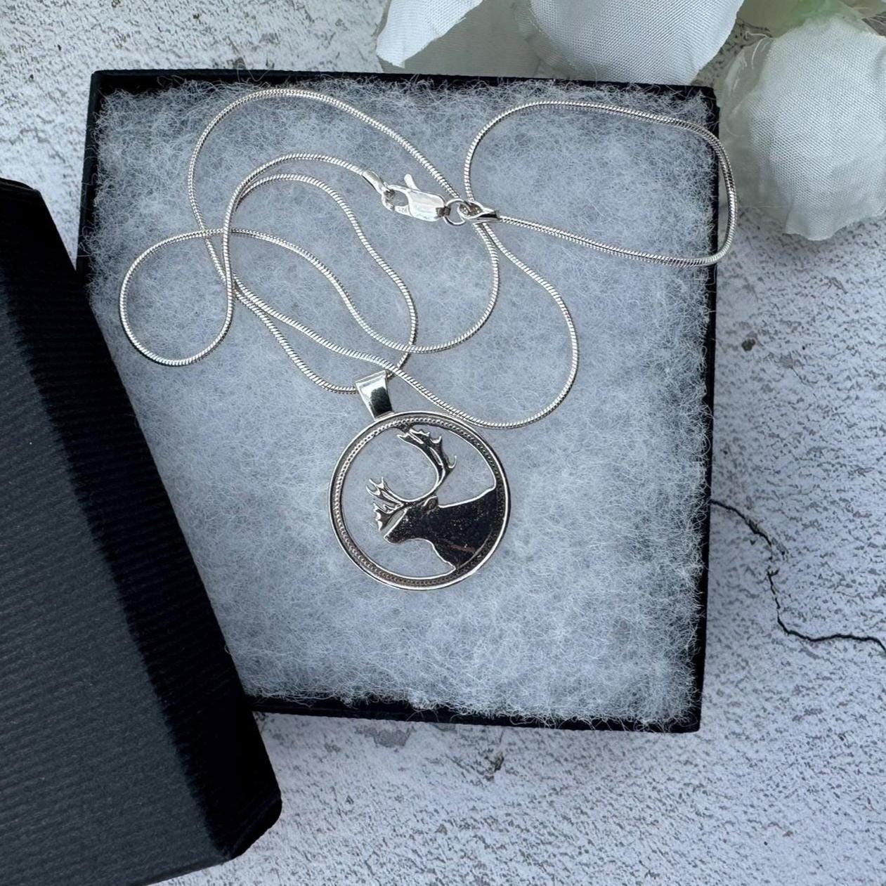 A very cool vintage sterling silver open-work majestic Stag pendant necklace. The pendant could have been meticulously pierced out of a very old Canadian quarter silver coin that features a Caribou/Reindeer however, the reverse is plain and the edge isn't reeded. If it were originally a coin it has taken a lot of work and a high level of skill to transform and create this piece! The pendant has a heavy duty fan shaped bale at the top and suspends from a quality sterling silver snake chain.